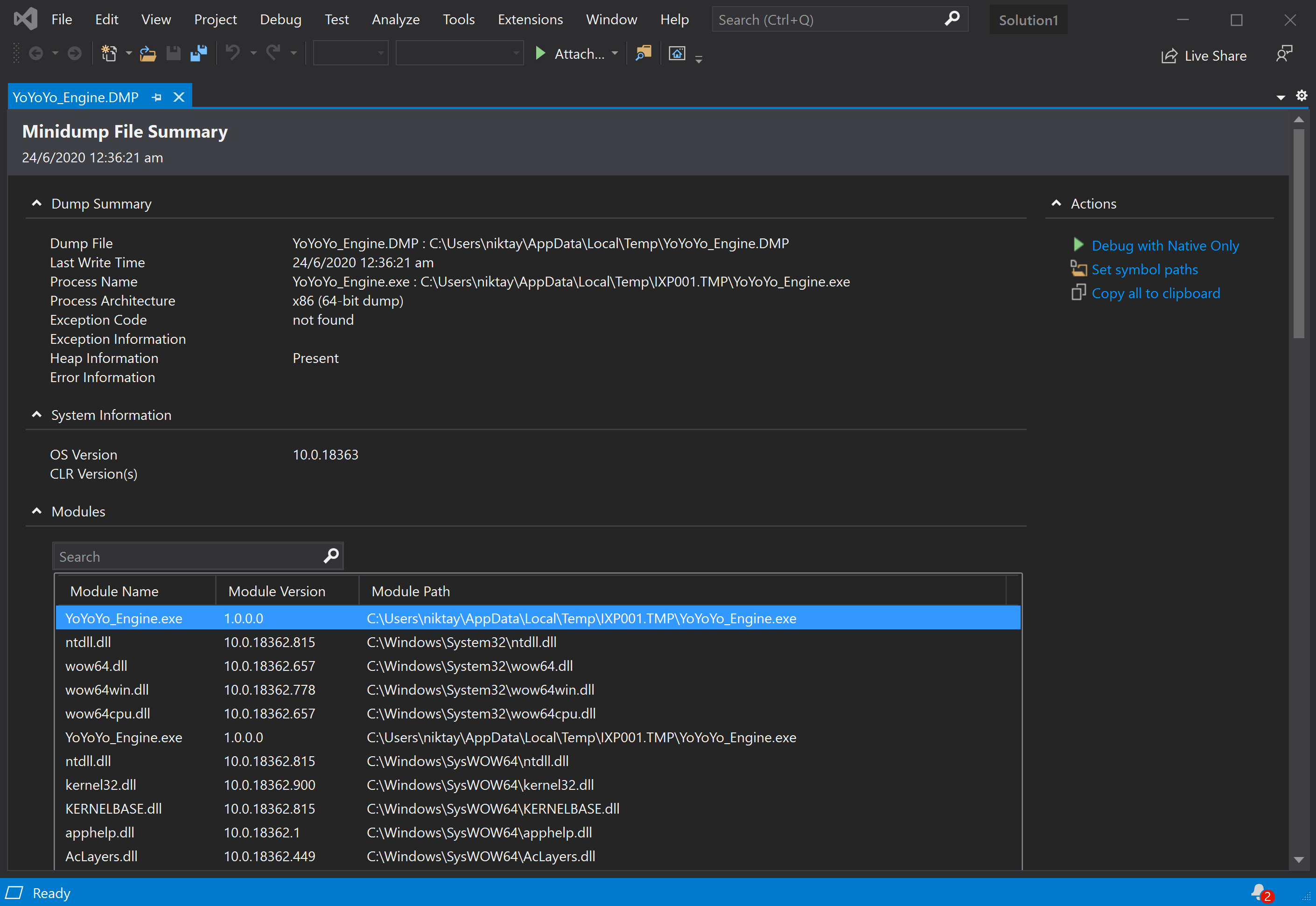 As seen above, opening the memory dump in Visual Studio shows us that YoYoYo_Engine.exe