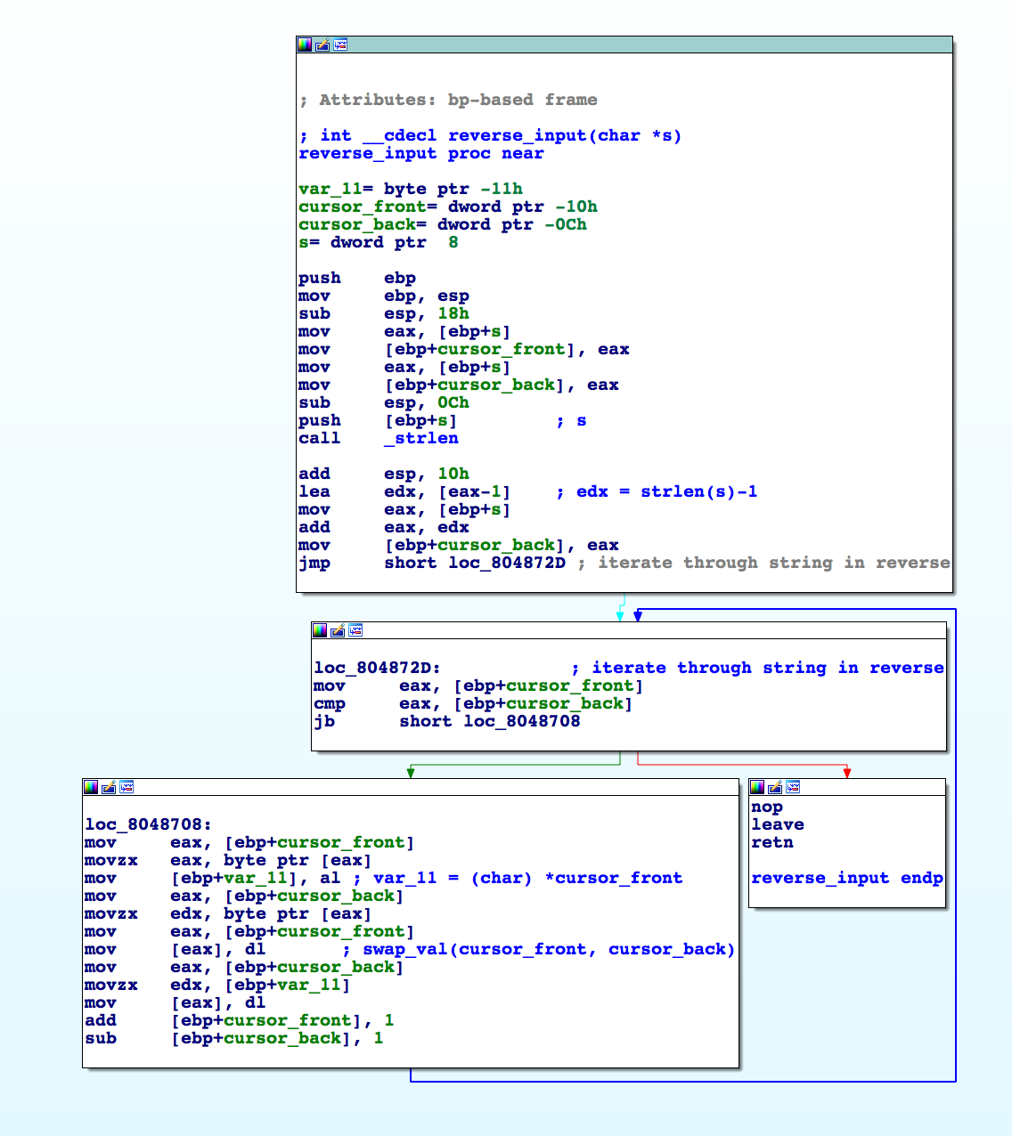 is simply reversing our input. It first gets a pointer to the end of our input using input + (strlen(input)-1)