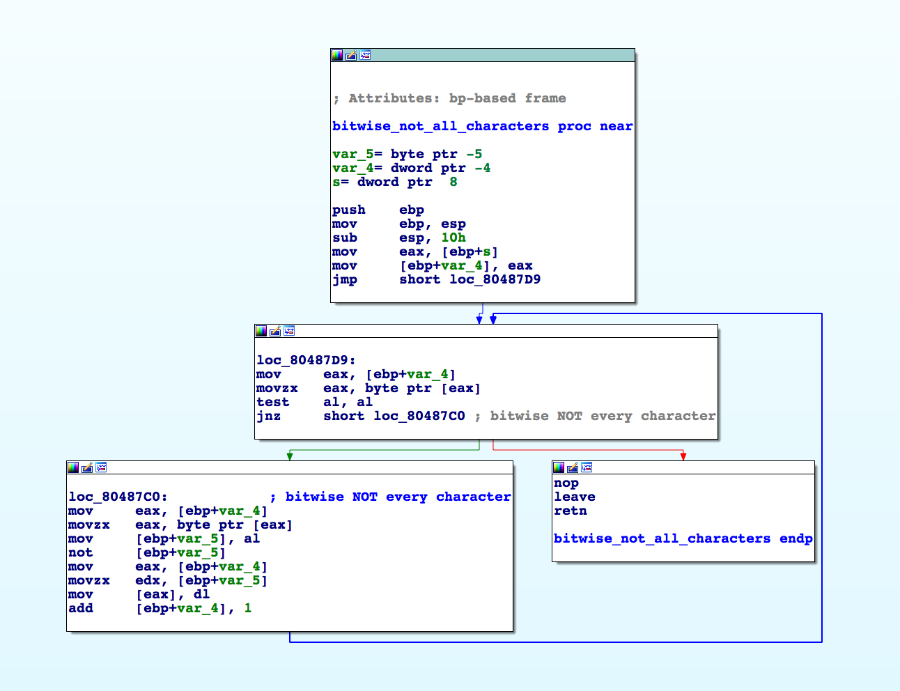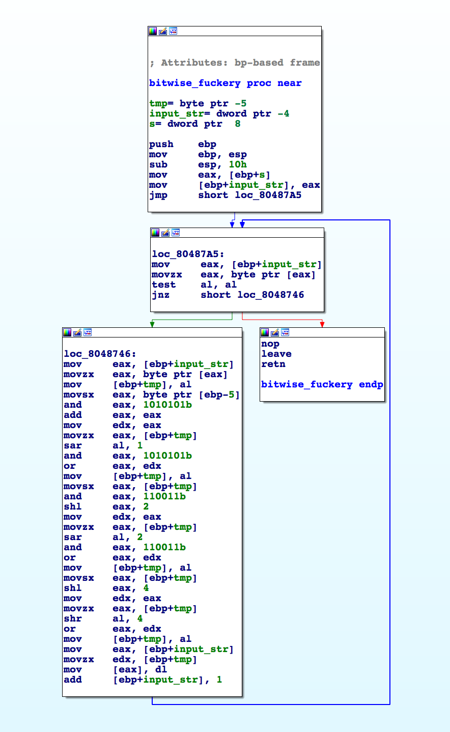 iterates through each character in our string and performs a number of bitwise operations to transform it.